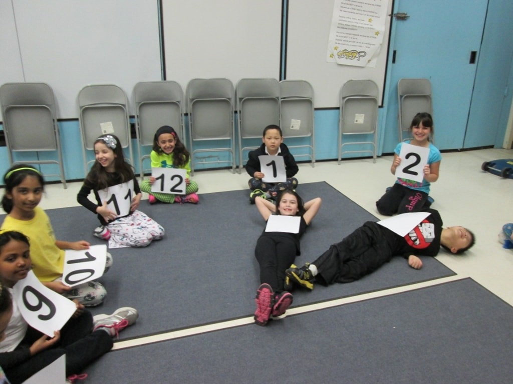 Next, split your class into two groups. Line each group by a pile of paper near an empty space and so give them a time and a countdown. On go, students grab a sheet of paper. If they get a number they become that number on the clock and if they get a bare sheet they get ane of the clock hands.