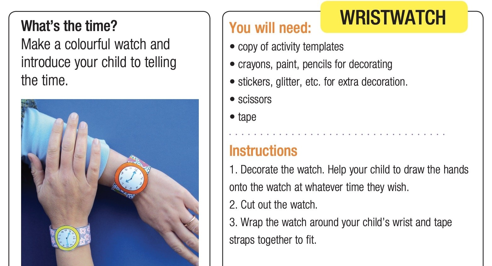 In form, hand out each watch to your students and allow them decorate them how they want. And so cut out the watches and tape them to your students' wrists.